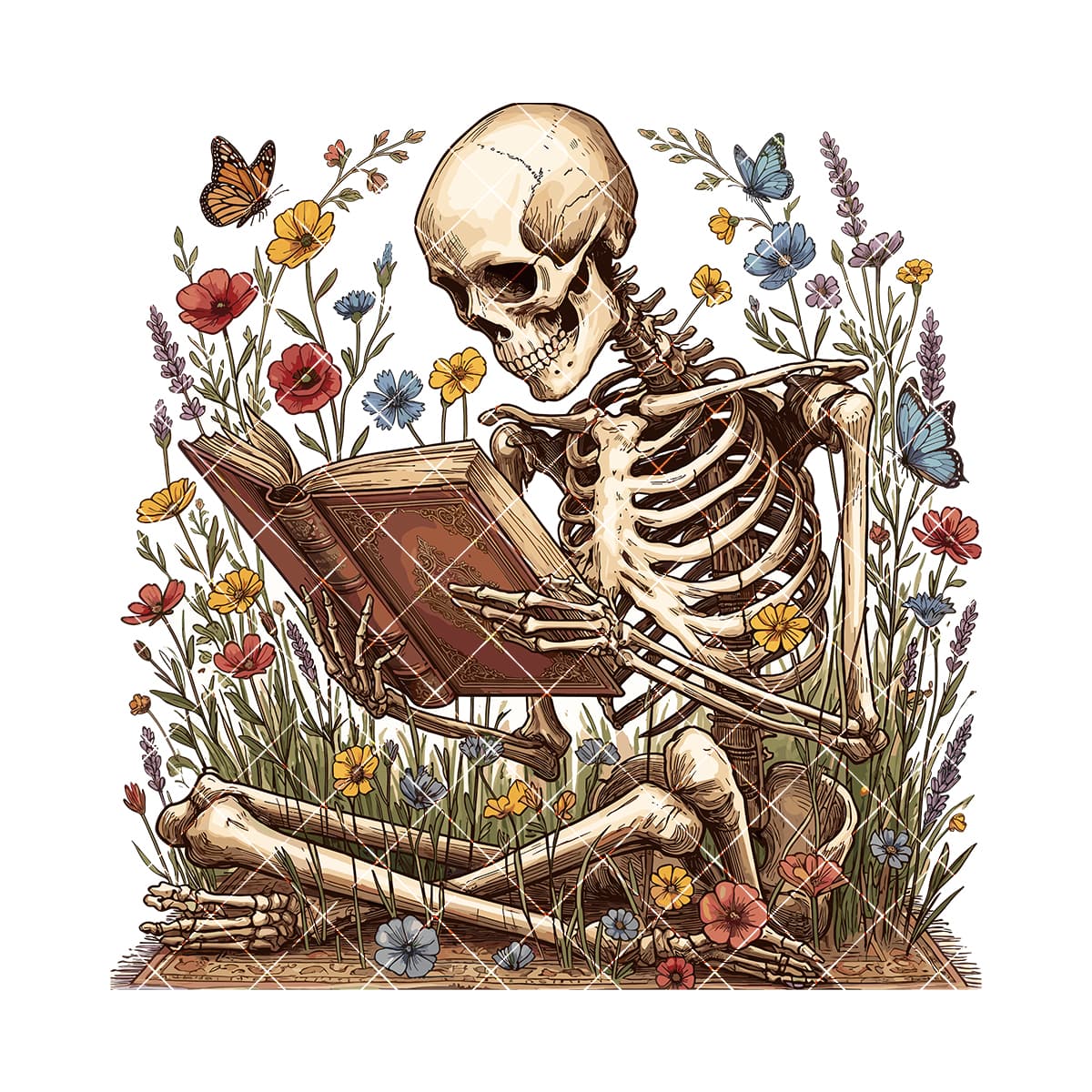 When you’re pressing a product, you need graphics that do the heavy lifting for you. You want deep, rich inks, flawless edges, and artwork that makes your customers stop scrolling instantly. This vintage-inspired skeleton, lost in a good book and surrounded by blooming wildflowers and delicate butterflies, is crafted exactly for that purpose. The linework is meticulously detailed so it won’t wash out, and those vibrant floral tones are formulated to transfer beautifully, giving you that premium, boutique-quality finish every single time.